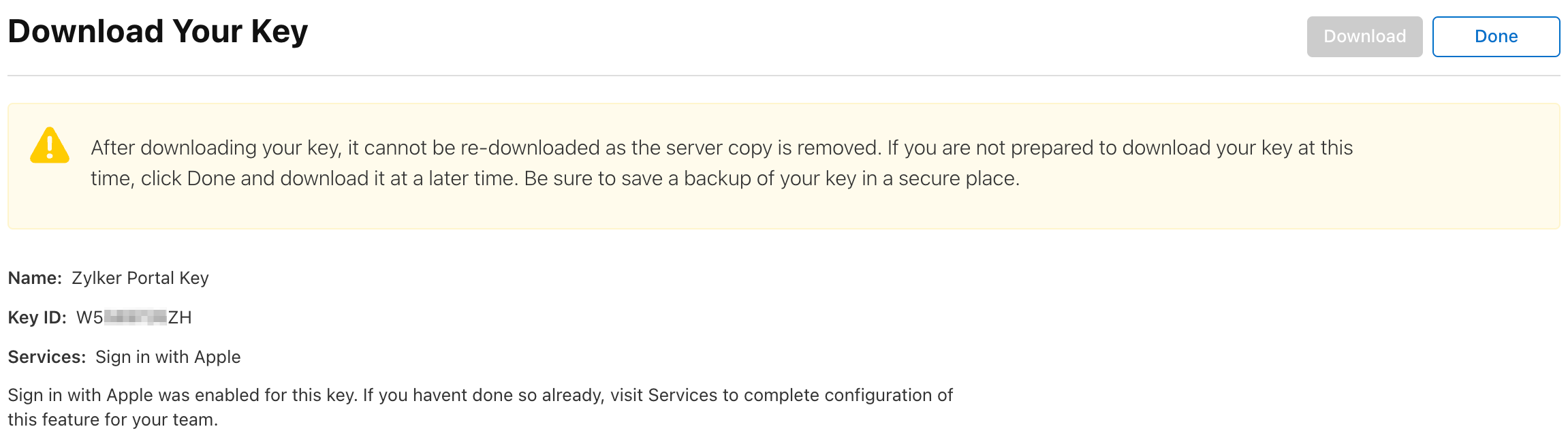Apple will generate a new private key for you and let you download it only once. Please download and safely store the .p8 file. Also note that the Key ID displayed here will be required later. Click Done.