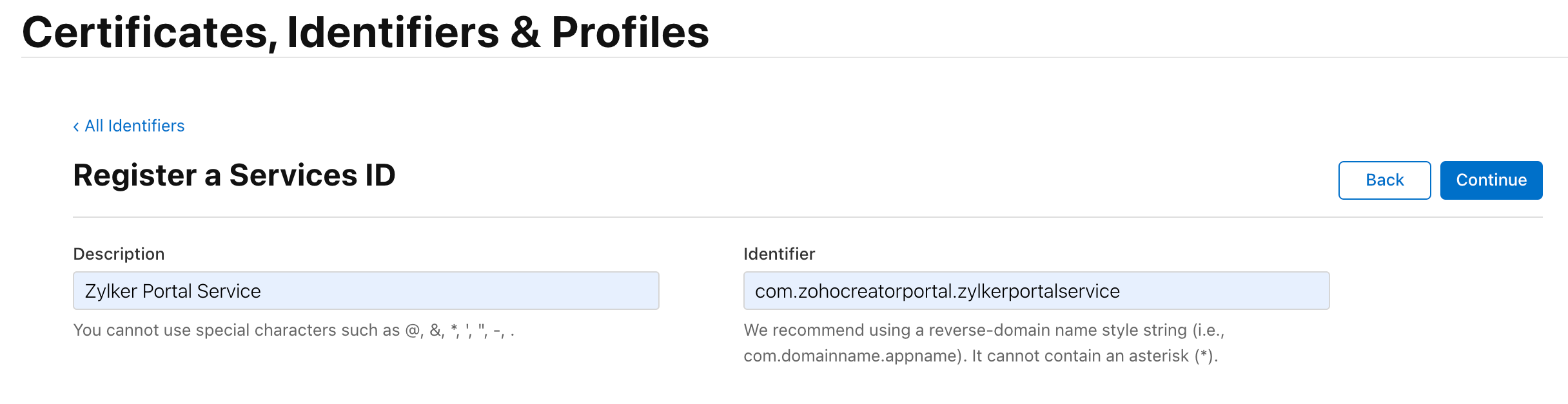 - On the next screen, you’ll have to enter a description and identifier for the Services ID.