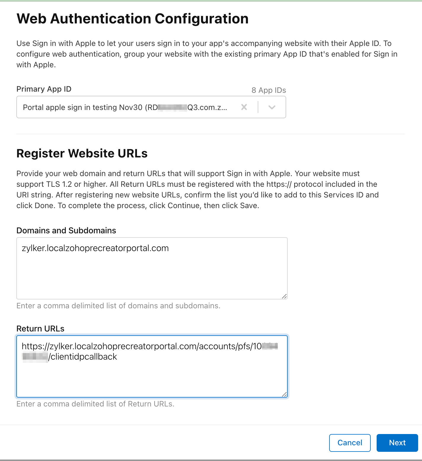 In the Web Authentication Configuration popup, enter the Redirect URI copied from Zoho Creator in the Return URL field. Subsequently, enter the domain of the Redirect URI in the Domains and Subdomains field.