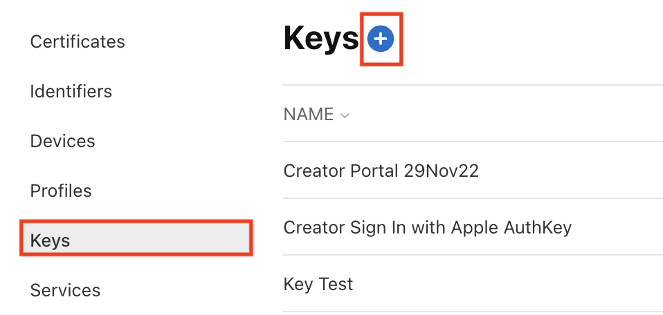 - Next, we'll be registering a new key. Back in the main Certificates, Identifiers & Profiles screen, choose Keys from the side navigation. Click the blue plus icon next to Keys.