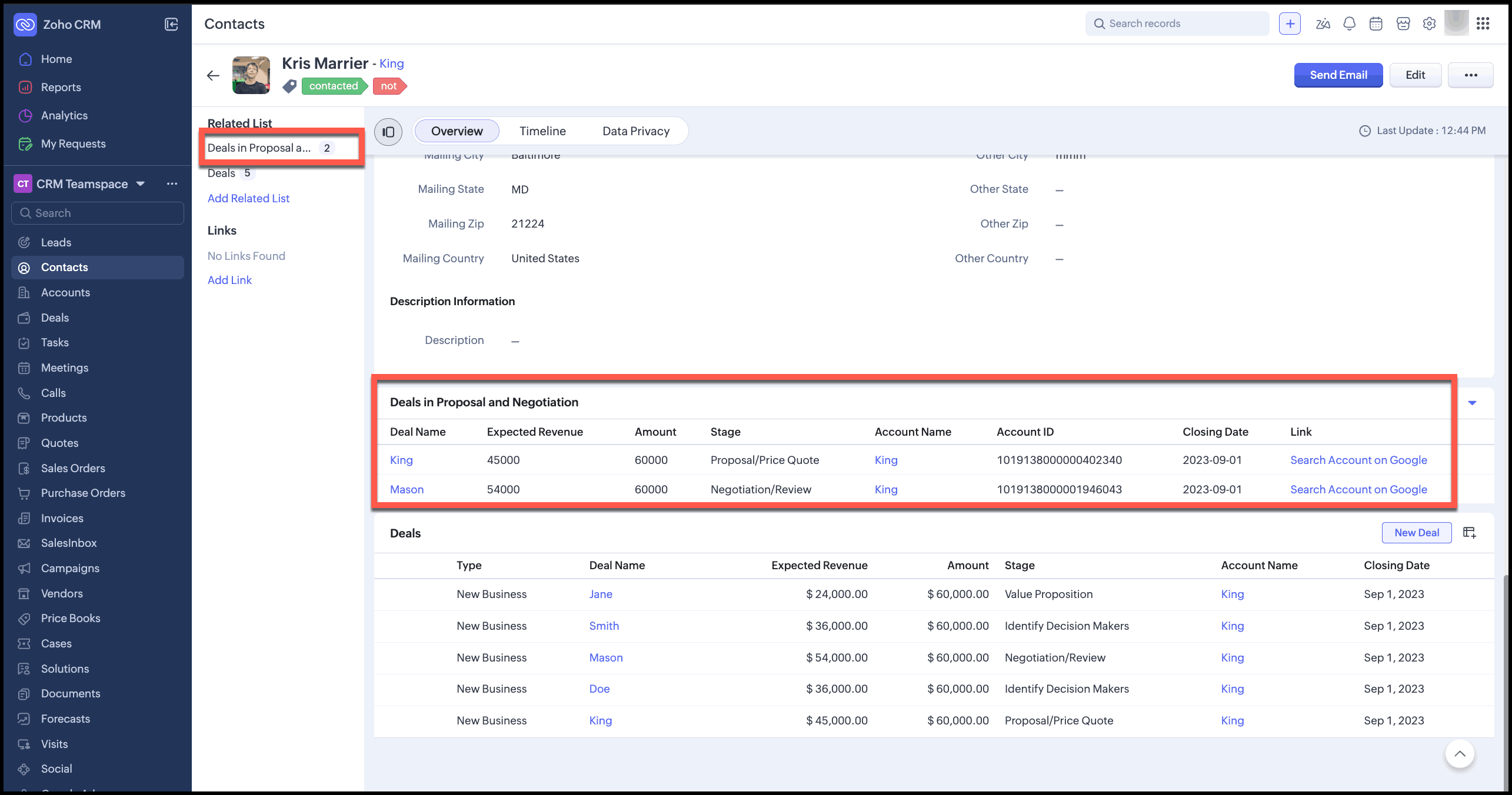 For example, consider that Deals is a related list in the Contacts module. A contact can have multiple associated deals, but you want to display only those that are won on your canvas. To achieve this, you can use the Queries feature and write a Module type or COQL type query to fetch data from the Deals module , and associate that query with Canvas' Detail View.