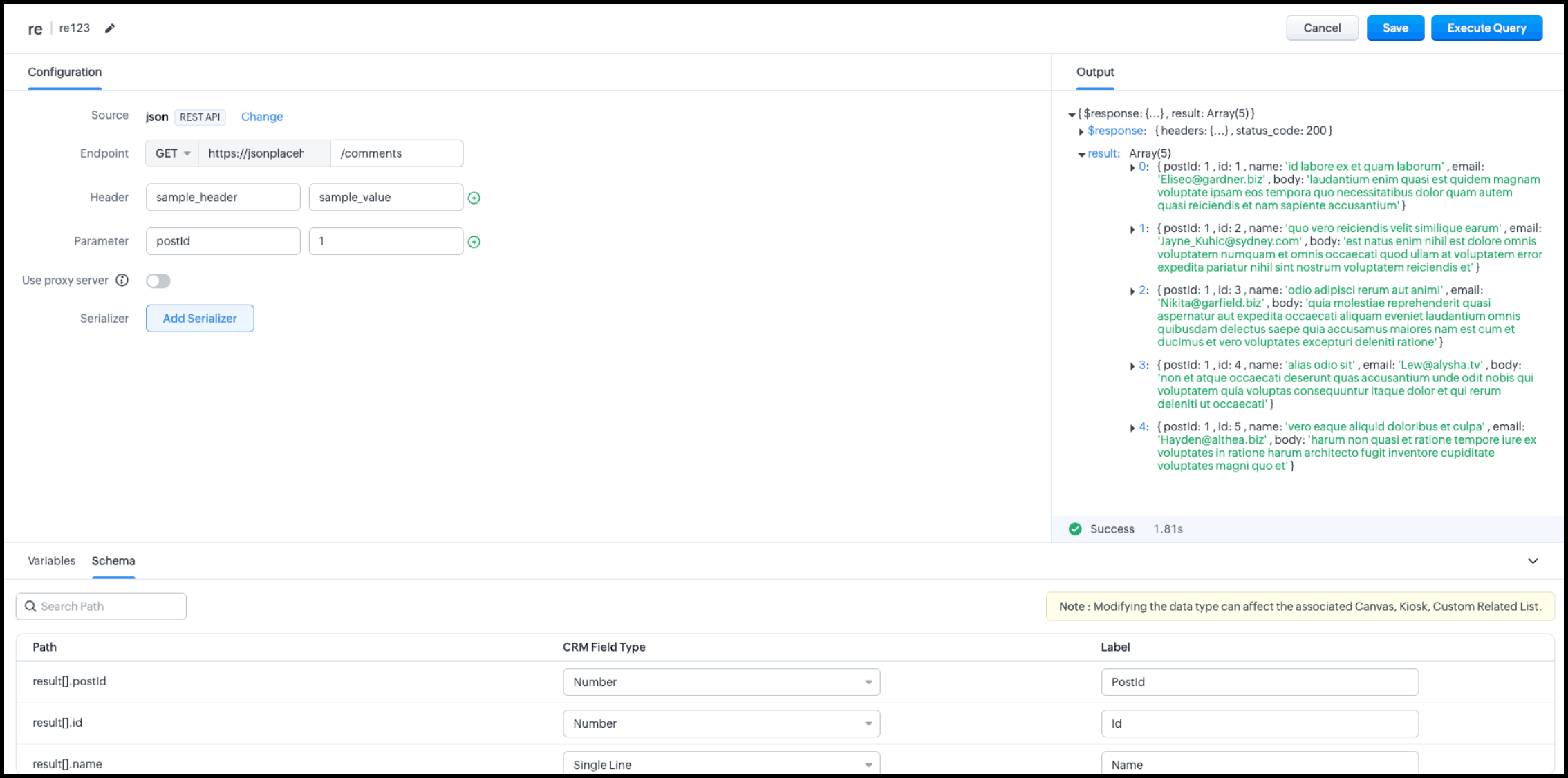 Under Schema, you can see the Path, CRM Field Type, and the Label. Path indicates the JSON path in the response that the field is available in, CRM field type indicates it's field type in CRM such as long int, int, and the label indicates the label/name of the field. You can edit these values based on what you need in the query's response.