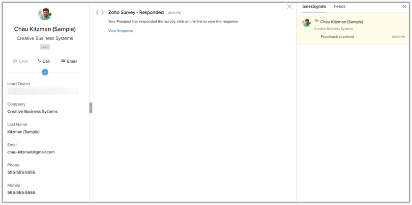 Let us consider an example scenario where we have a survey in Zoho Survey. When a user responds to that survey, a function raises the signal in Zoho CRM and displays the details of the survey in a widget.
