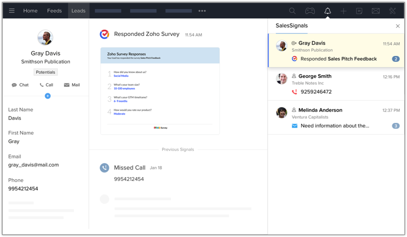 Here is a sample of how the widget displays a signal in Zoho CRM.