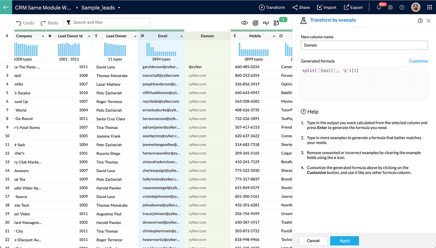 Simply explain your data preparation needs in natural language, and Ask Zia, our generative AI assistant, will generate the required data transforms instantly. Ask Zia, your DataPrep Copilot can handle more than one query at the same time and enables you to prepare data effortlessly.