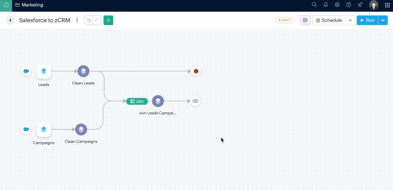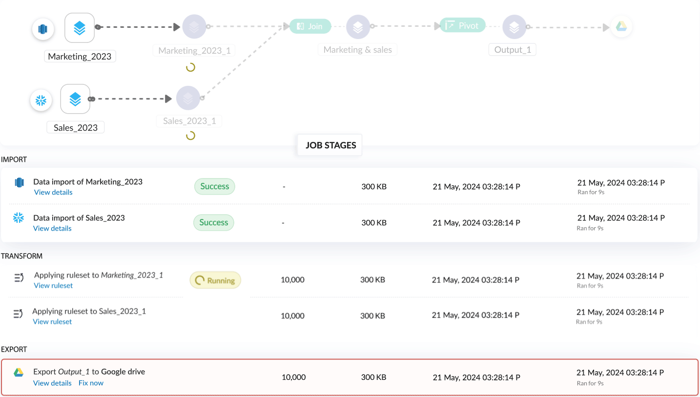 The all-new pipeline canvas lets you design the end-to-end data flow seamlessly. Earlier, there was a limitation of working with a single dataset at a time, but in 2.0, data can be fetched from multiple sources, more than one dataset can be prepared and used simultaneously as well as the data can be exported to multiple destinations. This helps business visualize data better, simplify complex workflows, and work on data with more confidence. Learn more