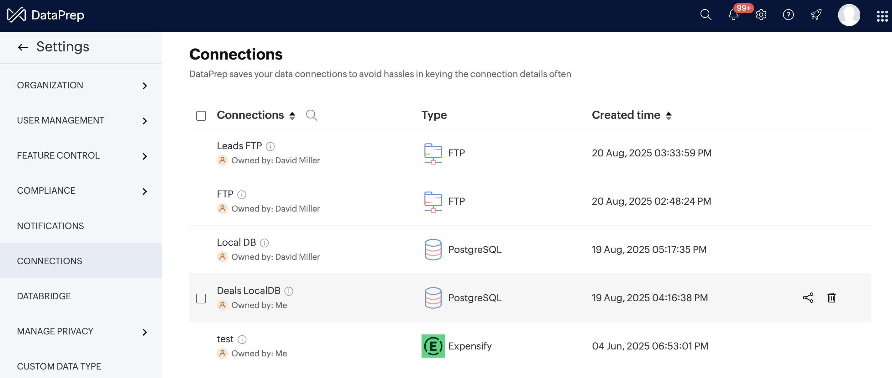EnhancementsYou can not only save Databridge connections but also now share them with other users in Zoho DataPrep. Learn more