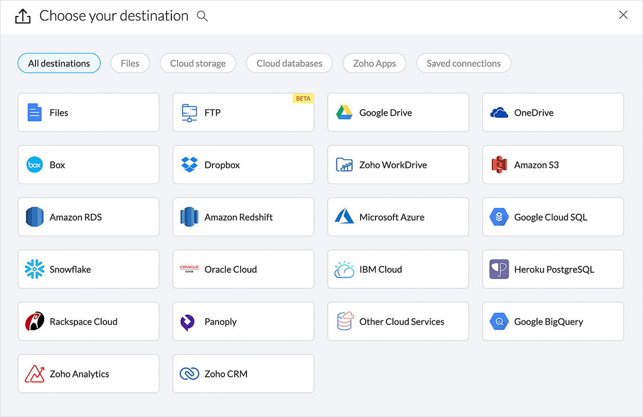 Ability to build automated data pipelines entirely depends on the platform's capability to connect to a variety of sources and destinations. With this in mind, we are adding a bunch of connectors to Zoho DataPrep. Zoho DataPrep 2.0 data connectors list now includes the below connectors and more to make data management easy by connecting to various business applications and storage solutions.