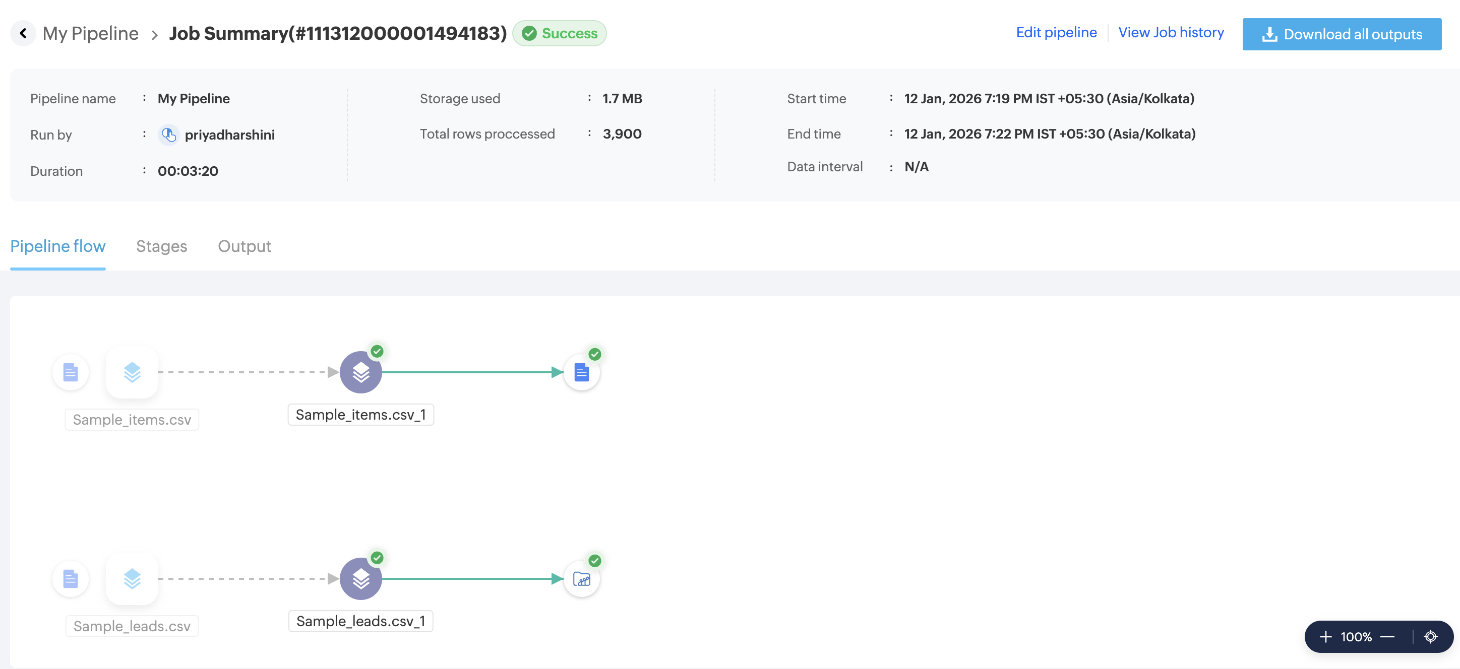 EnhancementsThe Job Summary page offers a comprehensive overview of each pipeline job, displaying key metrics of the job run like status, duration, rows processed, and storage. It now comes with granular data points, so you can analyze efficiency and verify outputs, with easy access to edit the pipeline, check job history, and explore execution specifics across the Pipeline Flow, each stage, and each output. Learn more