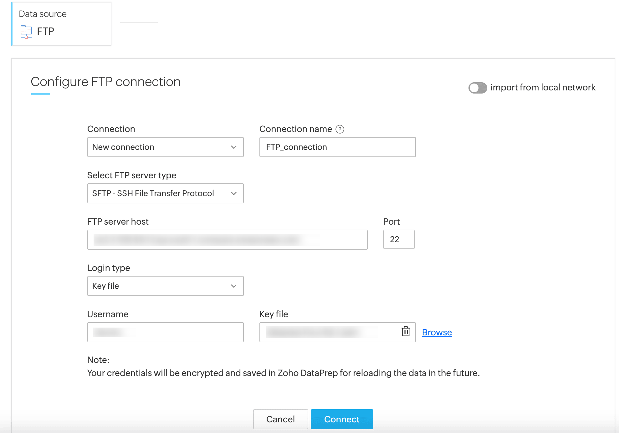 Zoho DataPrep now lets you login to your SFTP connection using the Key File option. Users can now upload the Key file and create the connection. Learn more