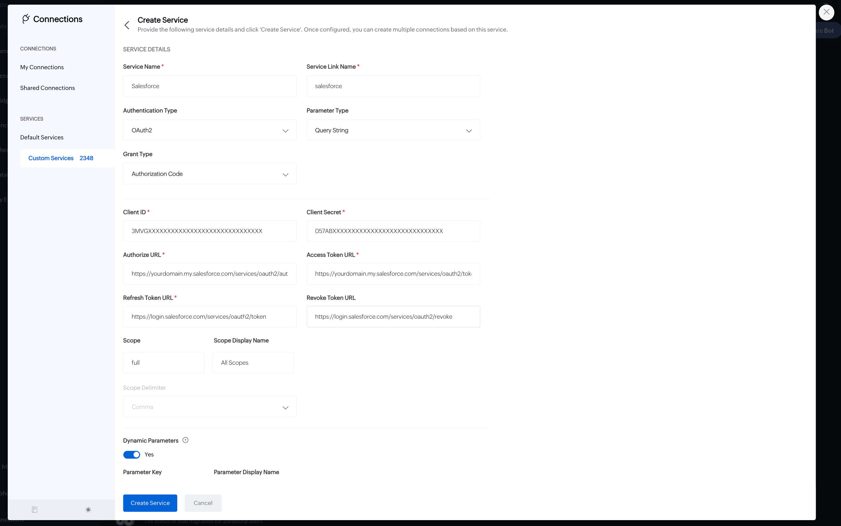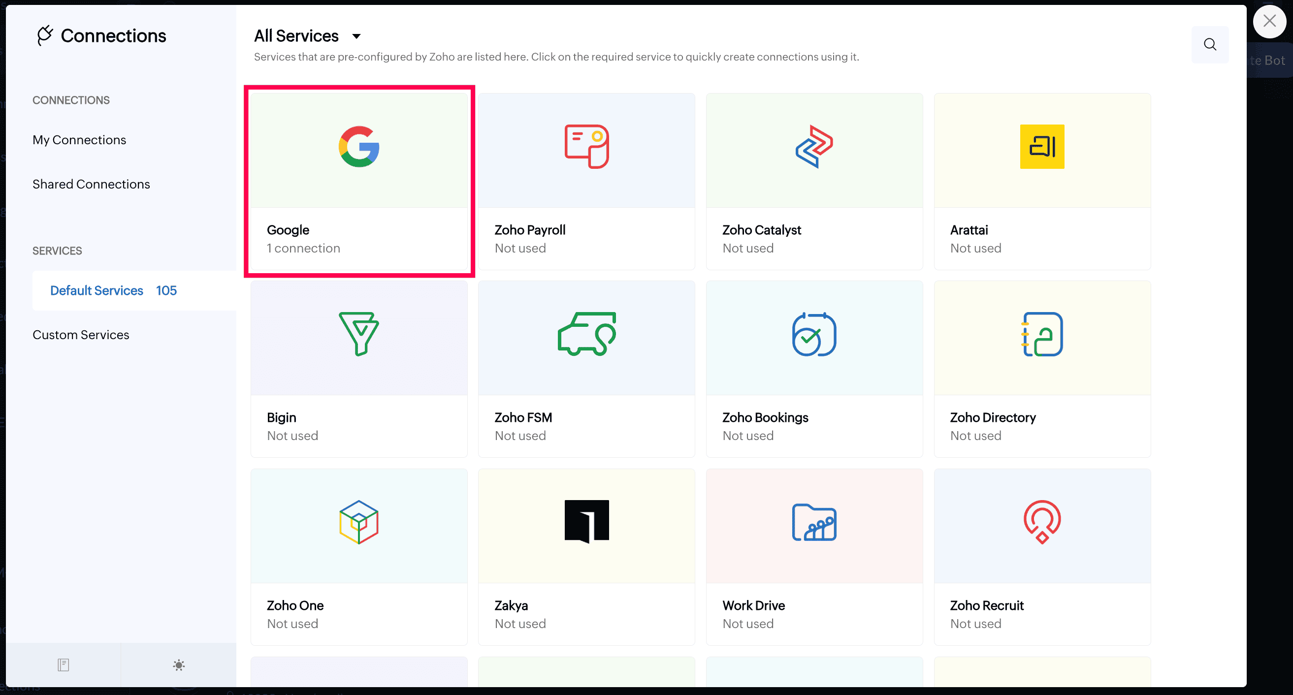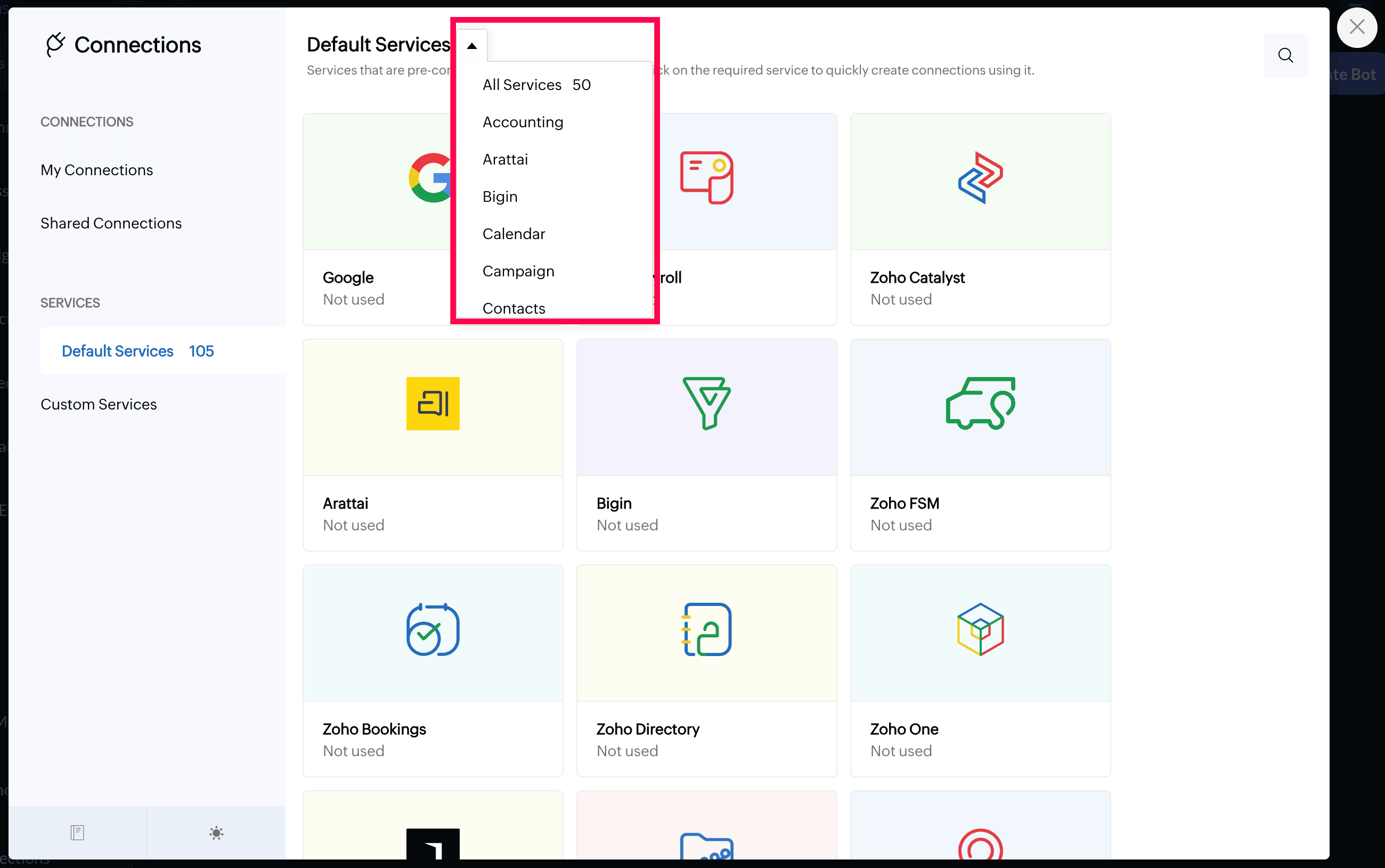 - Custom services: If your required service is not available in the default services list, you can configure it on your own. Once the service is configured, you or any member of your organization can create as many connections as required using it by providing credentials.