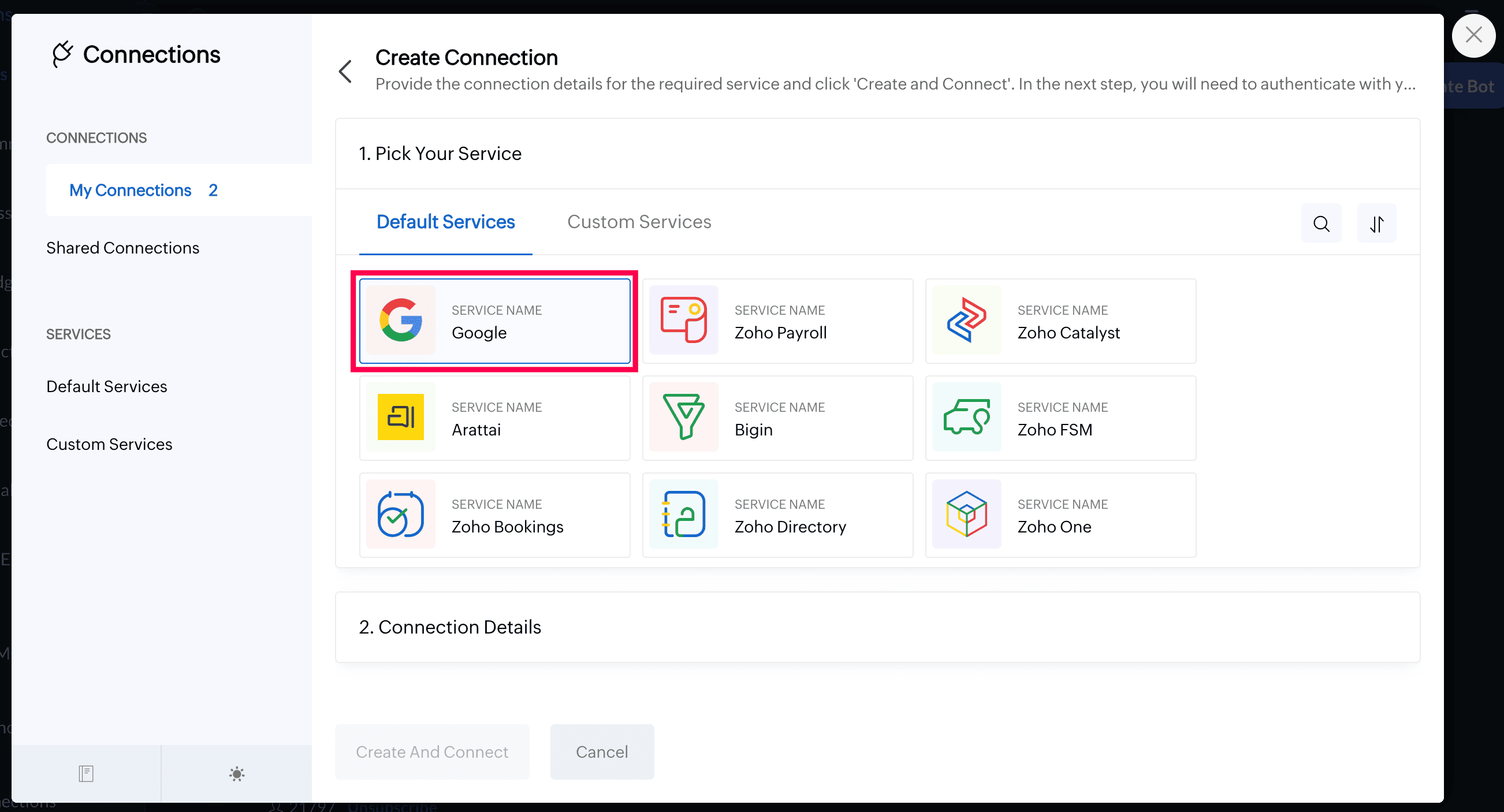 - Under "Pick Your Service" choose your required default or custom service with which you want to create the connection.