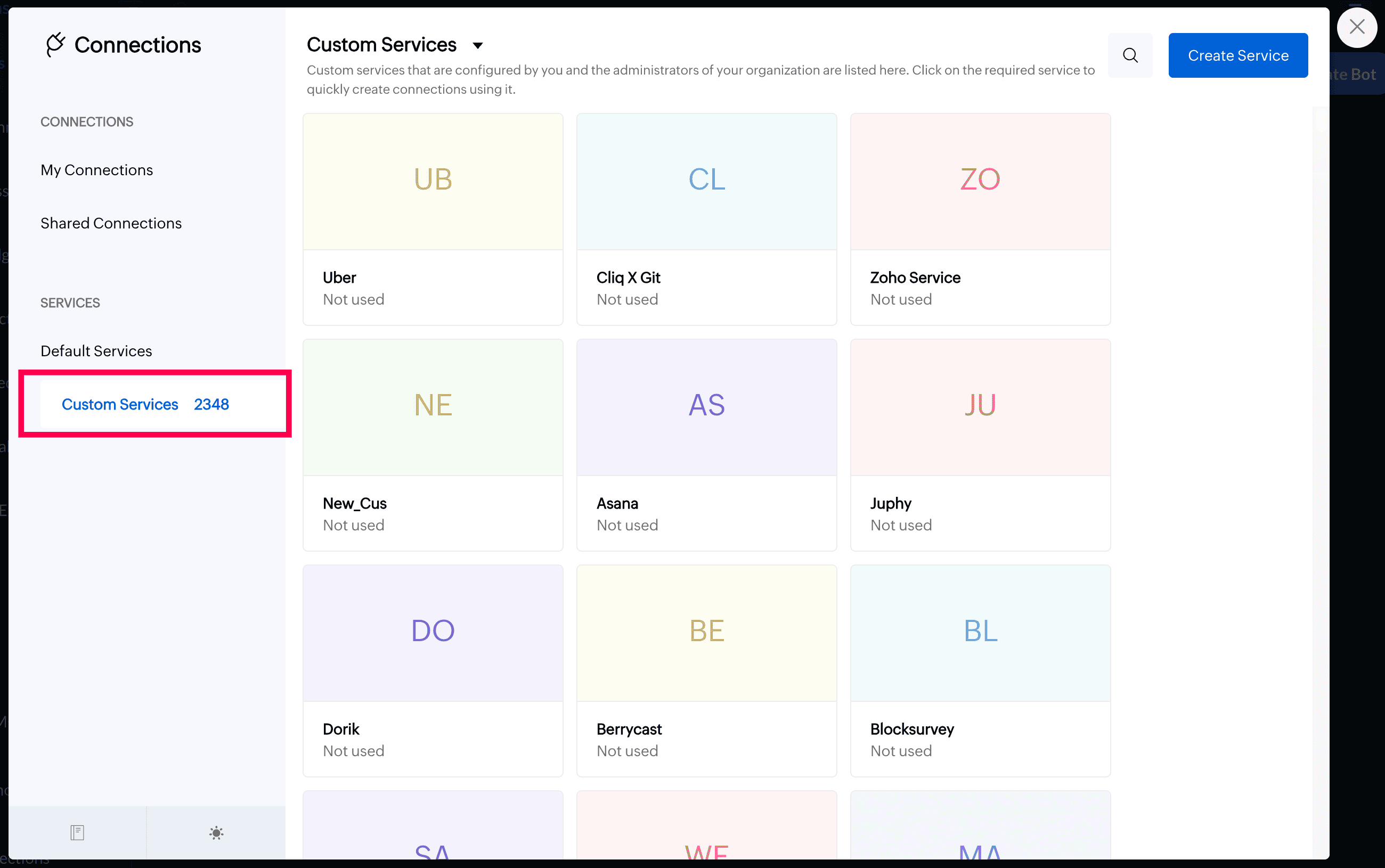 - Navigate to the Custom Services under Services. All the custom services created by you and other members of your organization will be listed here.