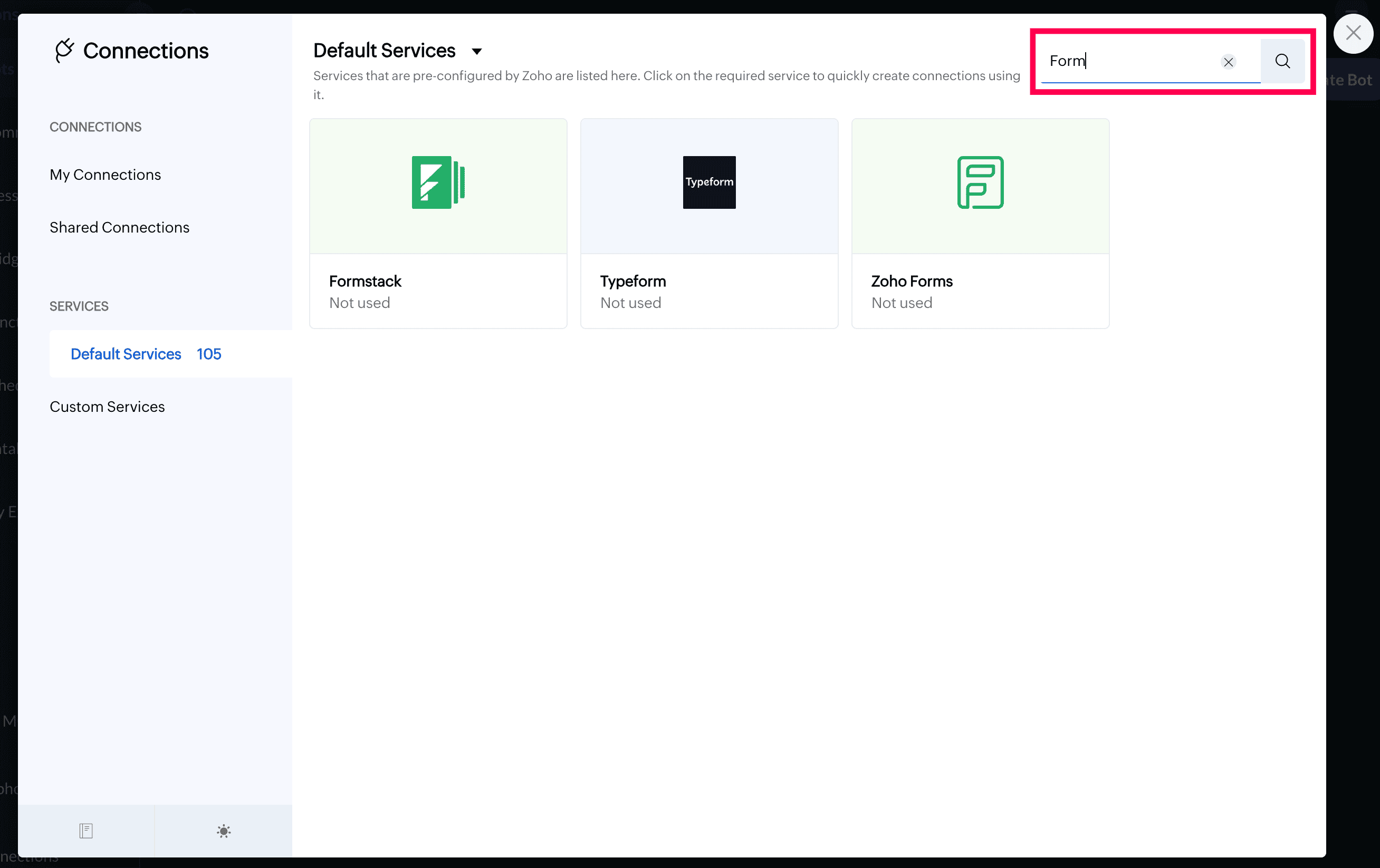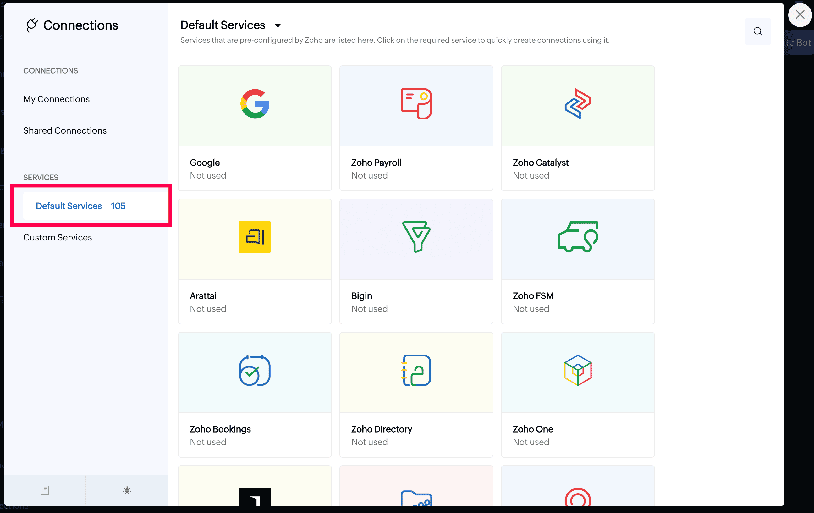 - Default services: These are pre-configured services. You can easily create a connection using default services and authenticate it using your credentials. Learn more.
