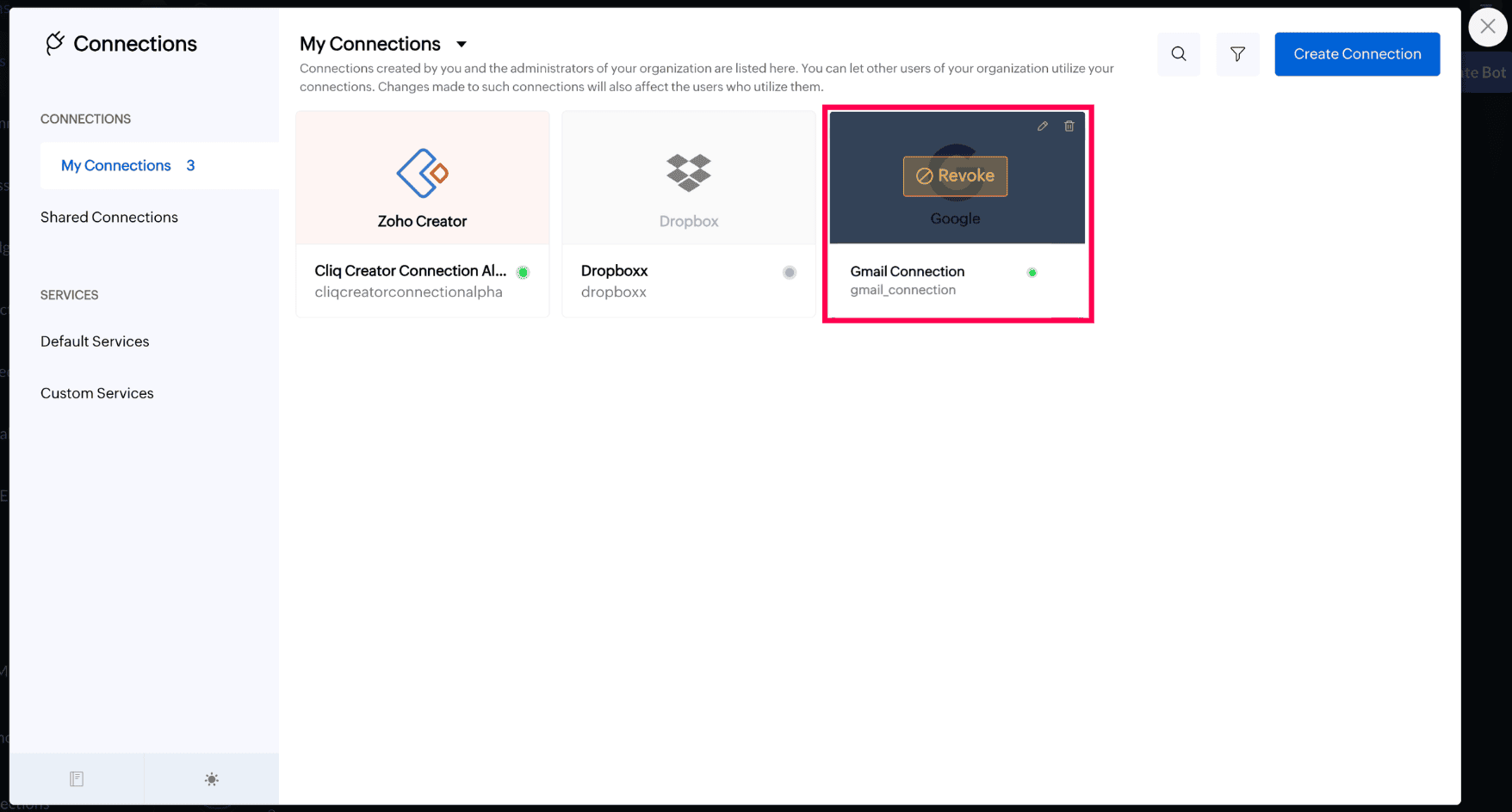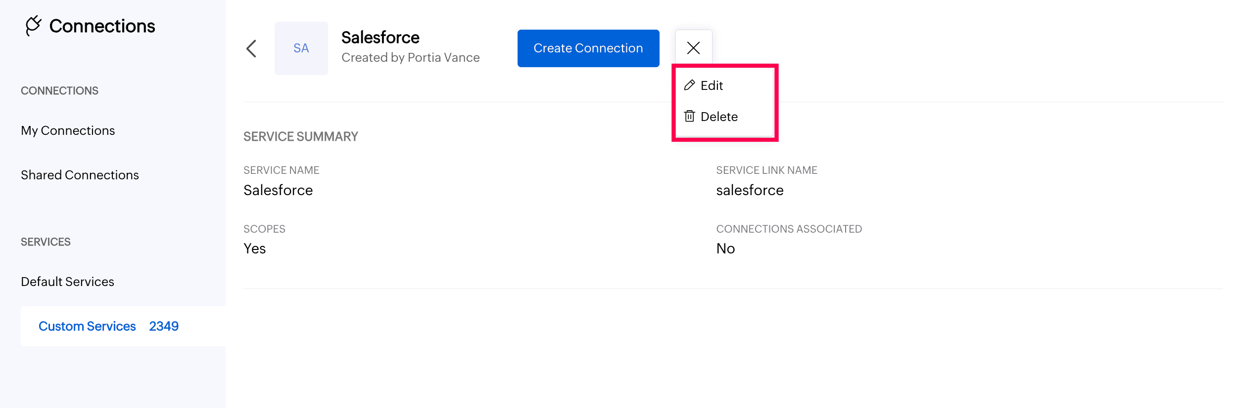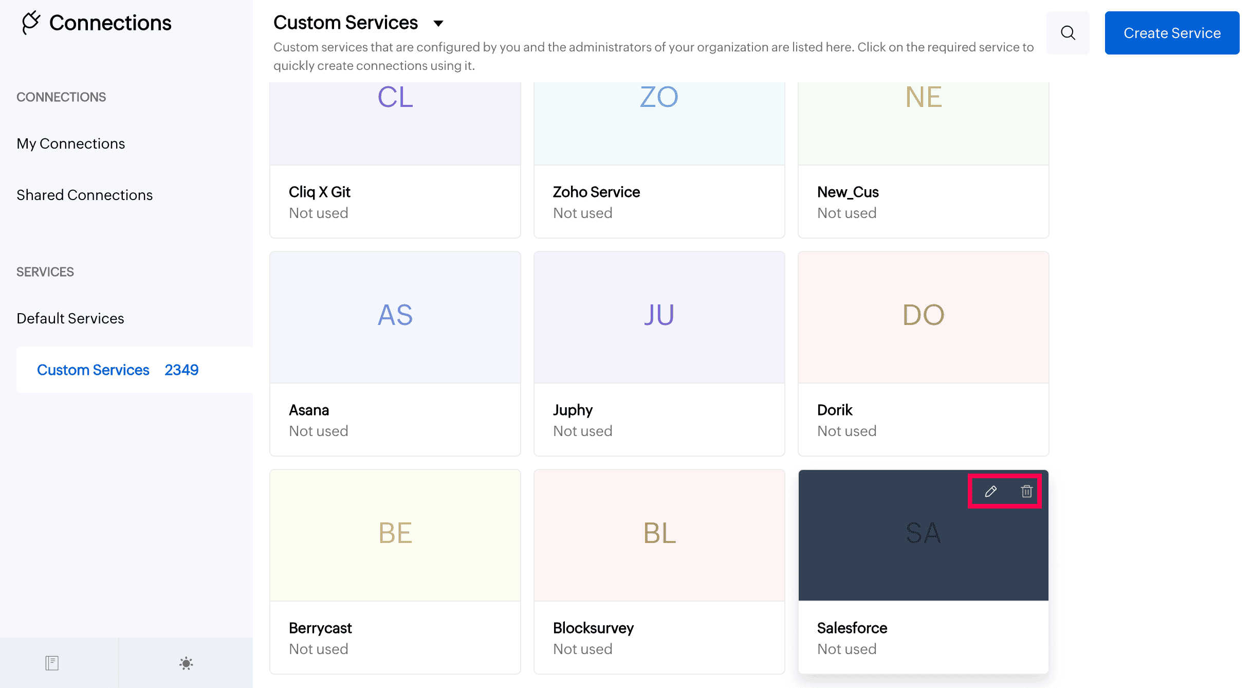 - If a custom service is edited or deleted, all the existing connections created using the service will be revoked.