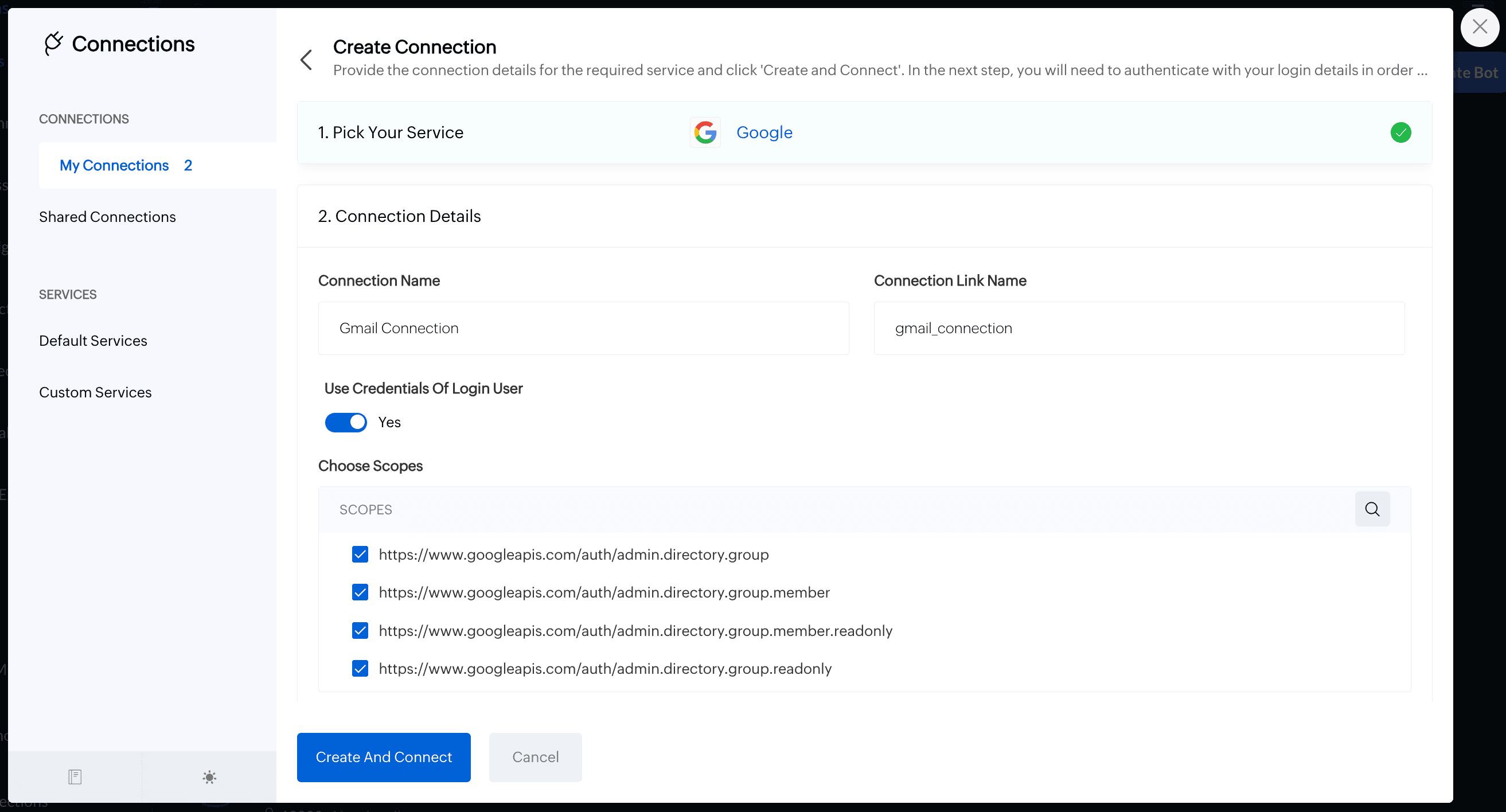 Note: The scopes and their availability vary depending upon the service that you pick. You can find the applicable scopes in the desired service's API documentation.- Click on Create and Connect.