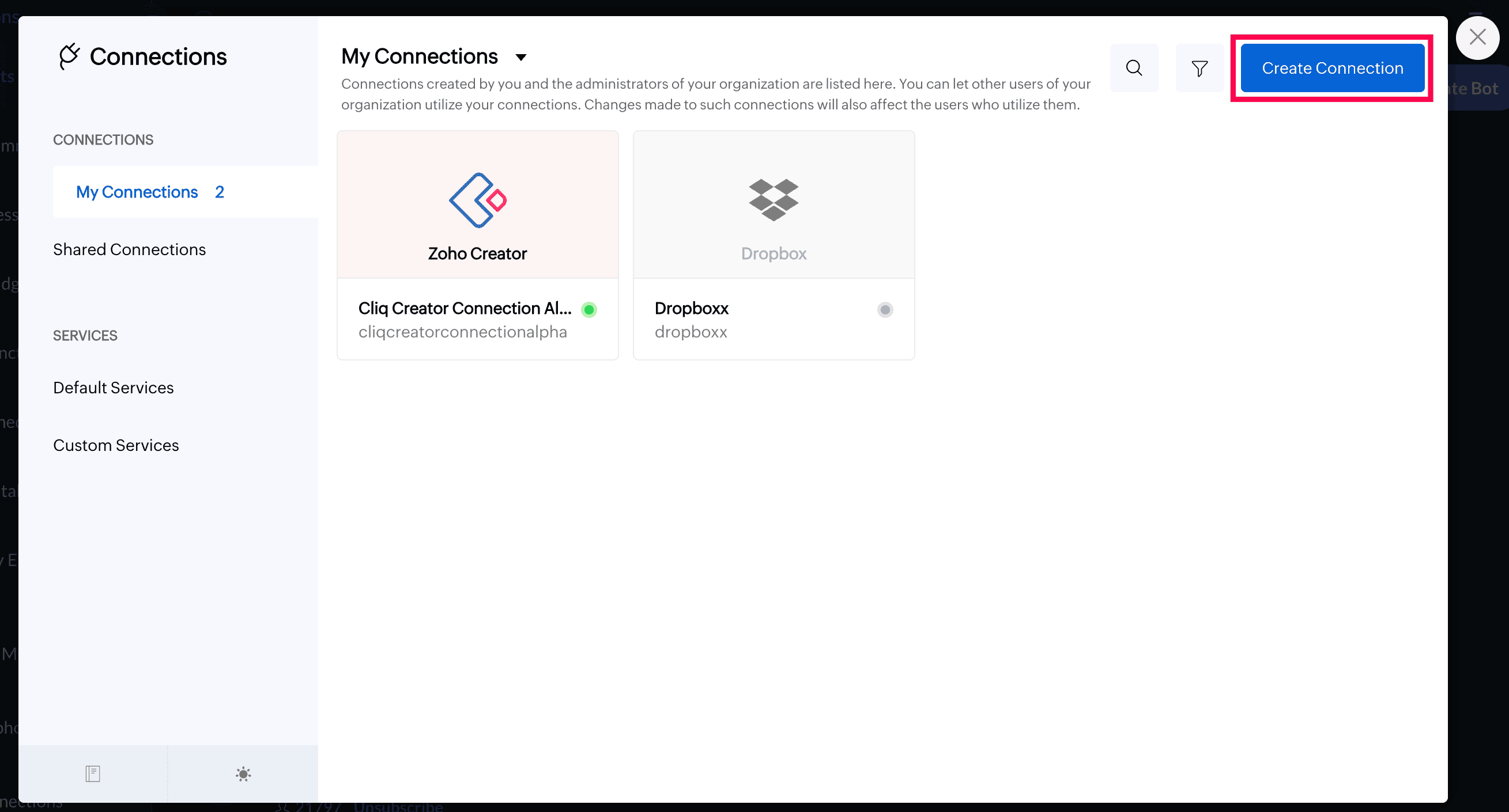 - Zoho Creator supports a different version of connections page. Click here to learn more.