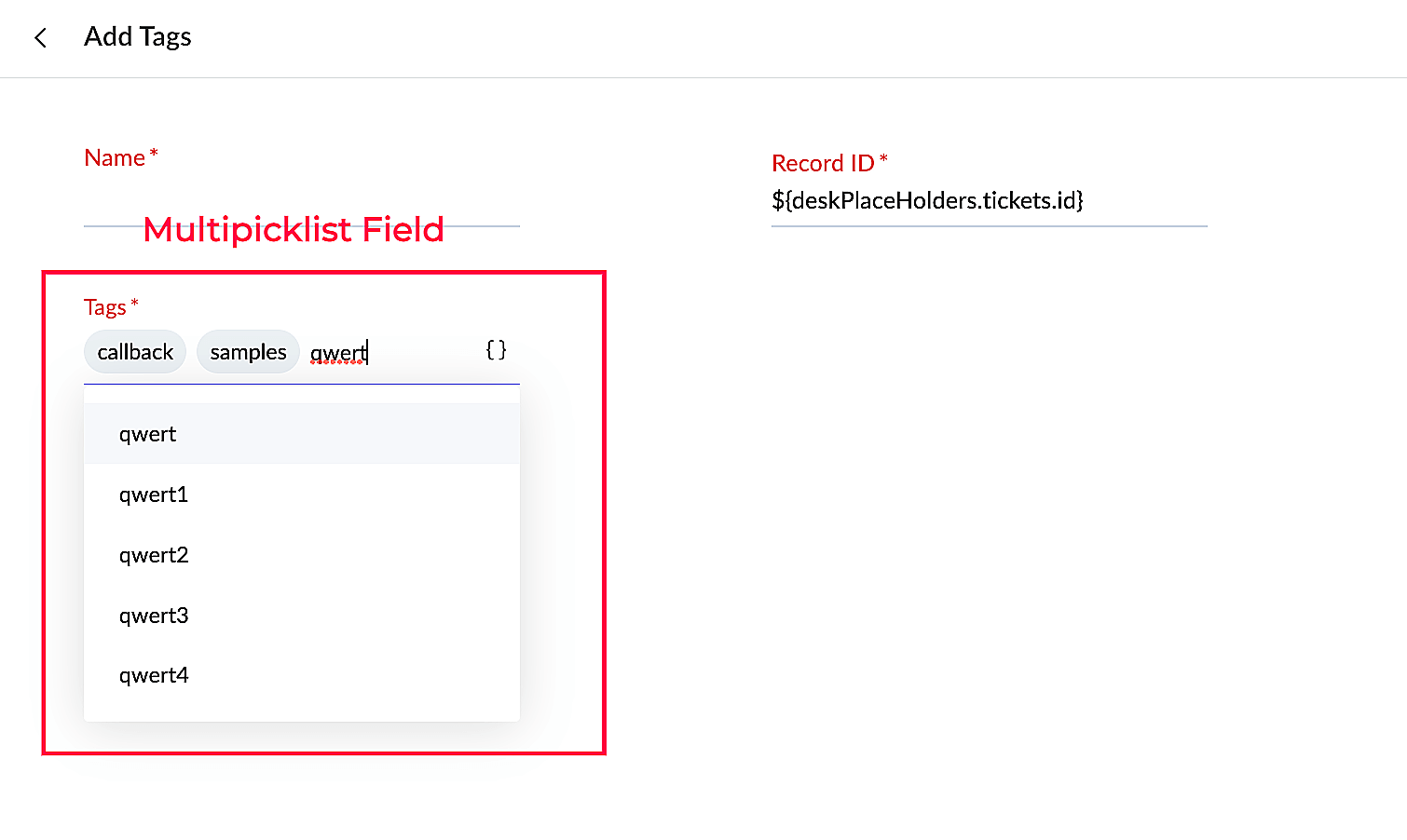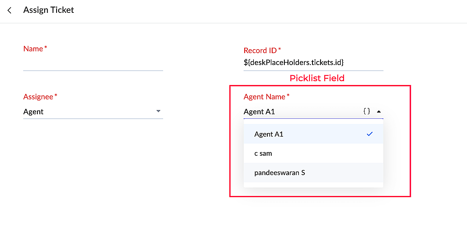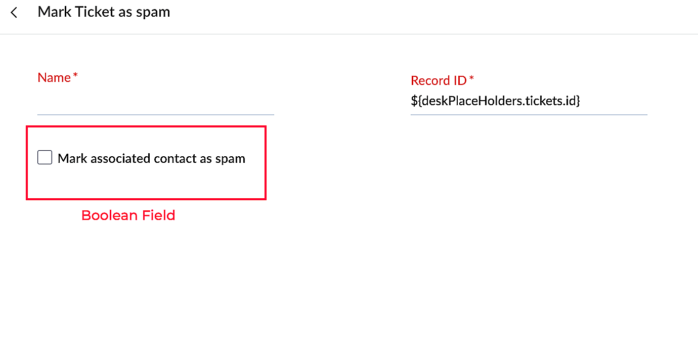 | context | Boolean | It shows the type of placeholders that must be displayed for the field. This key is optional .The value of this key must be one of the following: tickets|contacts|accounts|tasks|products|events|calls|departments|agents|teams The IDs of the above modules will be shown in the placeholders. |