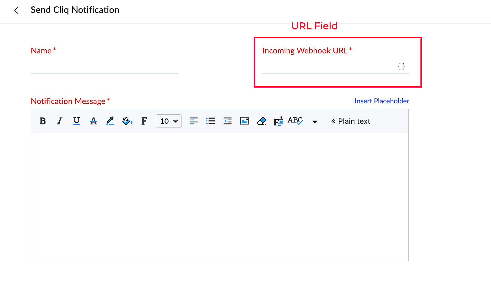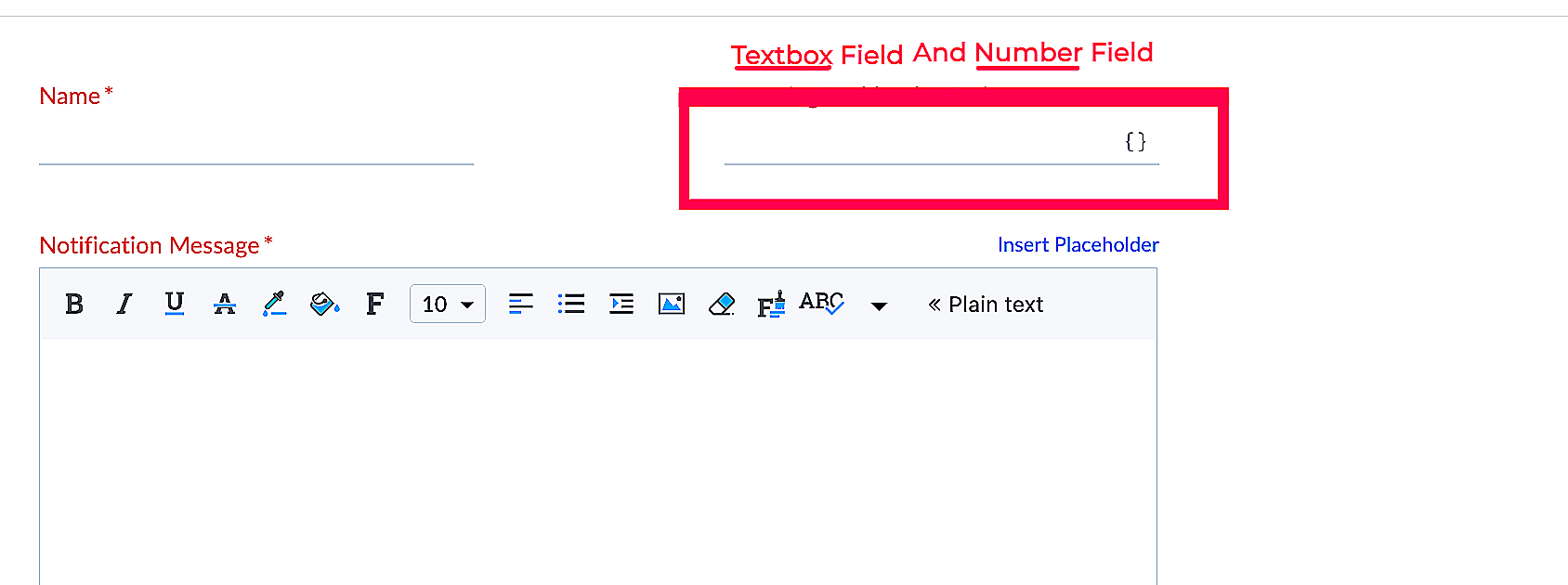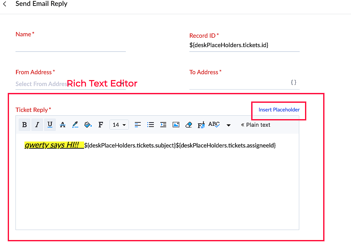 | context | Boolean | It shows the type of placeholders that must be displayed for the field. This key is optional .The value of this key must be one of the following: tickets|contacts|accounts|tasks|products|events|calls|departments|agents|teams The IDs of the above modules will be shown in the placeholders. |