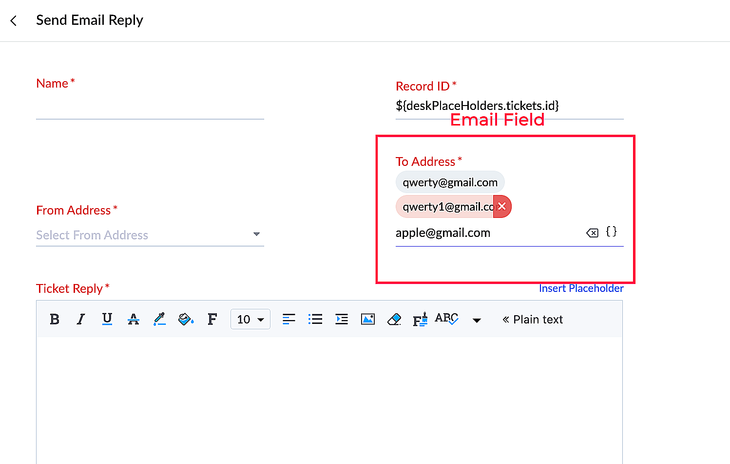 | isPlaceHolderNeeded | Boolean | It determines whether the field needs placeholder support or not. It allows you to map respective module fields available in desk. |