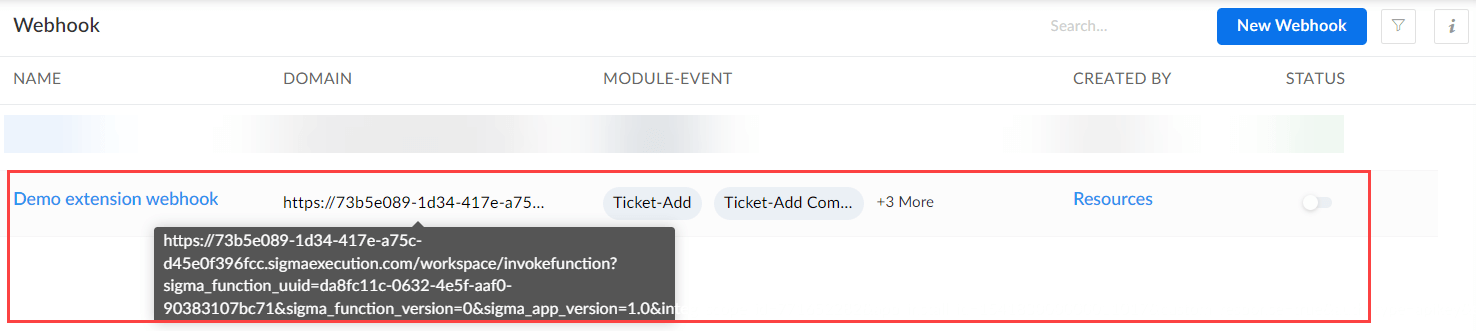 Now, the function will be executed via resource while installing the extension and the created resource will be displayed as shown below along with the details like Name, Domain (URL), Module-Event, Created By, and Status based on the inputs given in resource.json file.