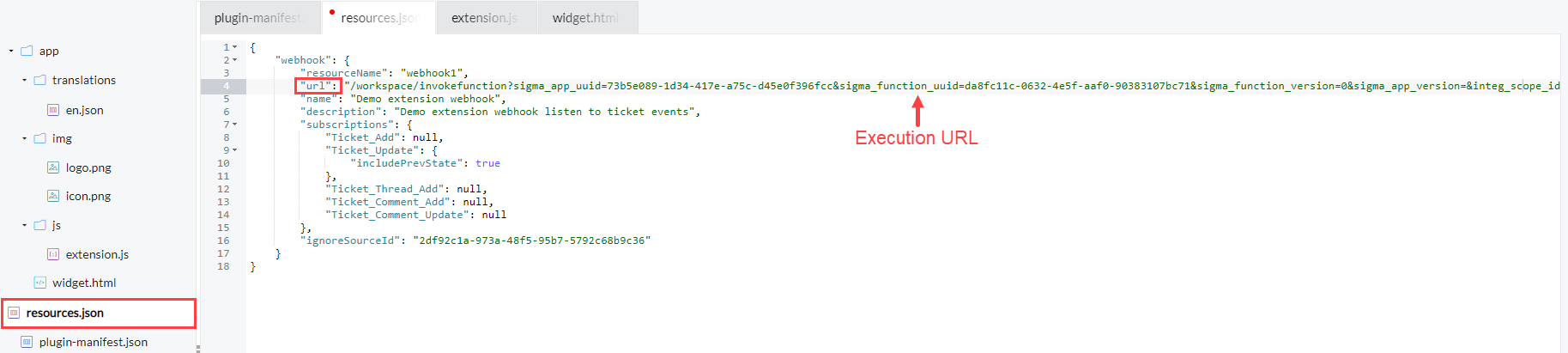 Let's look at how the function is executed via Resources (for example: Webhooks). You know that to create webhook on the event of extension_installation, you must specify the webhook details in resources.json file. In that resource.json file, to execute the functions via resources, you must provide the Execution URL (i.e., URL copied from functions in Extension Details page of Sigma) in the URL attribute.