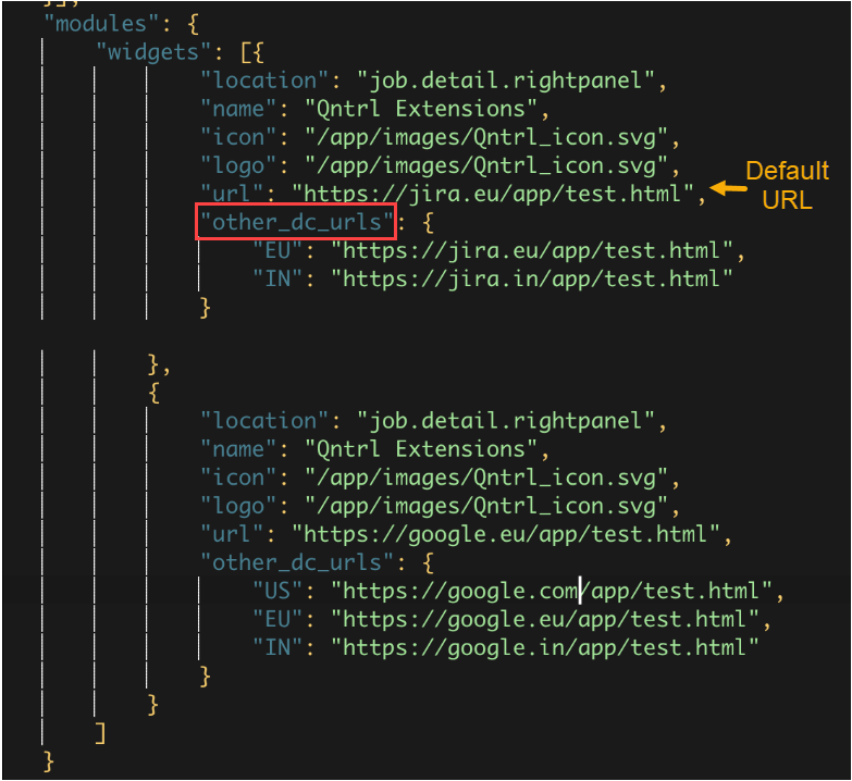 "modules": { "widgets": [{ "location": "desk.topband", "name": "DC Widget", "logo": "/app/img/logo.png", "icon": "/app/img/icon.png", "url": "/app/Widget.html", "other_dc_urls":{ "IN": "/app/Extension.html", "EU": "/app/Extension1.html" } }] }For Example: When you load EU DC, the URL against EU will be loaded with corresponding domain "EU" from "other_dc_urls" group. If any specific DC is not available in "other_dc_urls" group, then the default URL will be loaded.