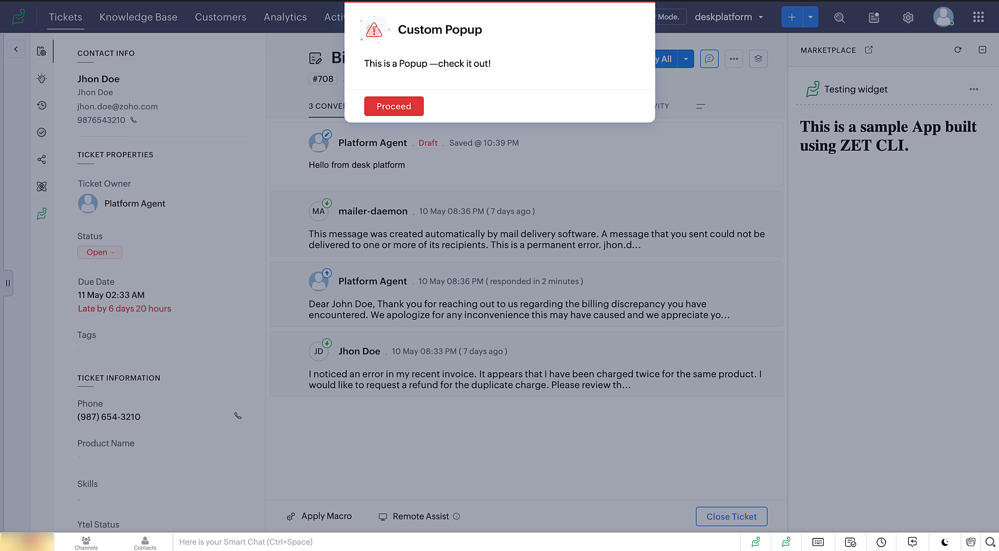 Pop-up methods allow you to display / pop-up the desired information on the Zoho Desk UI. You can find the list of pop-up methods below: