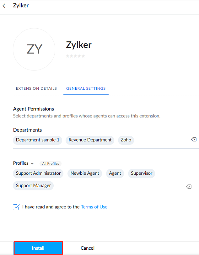 - In General Settings page of the extension, select the Departments and Profiles whose agents can access the extension.