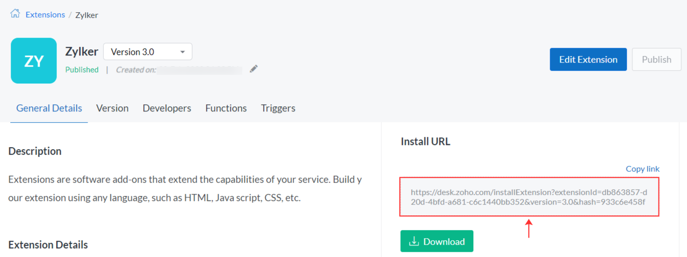 - To install your extension, click Extension Details button of the Extension you want to publish, under the published tab.