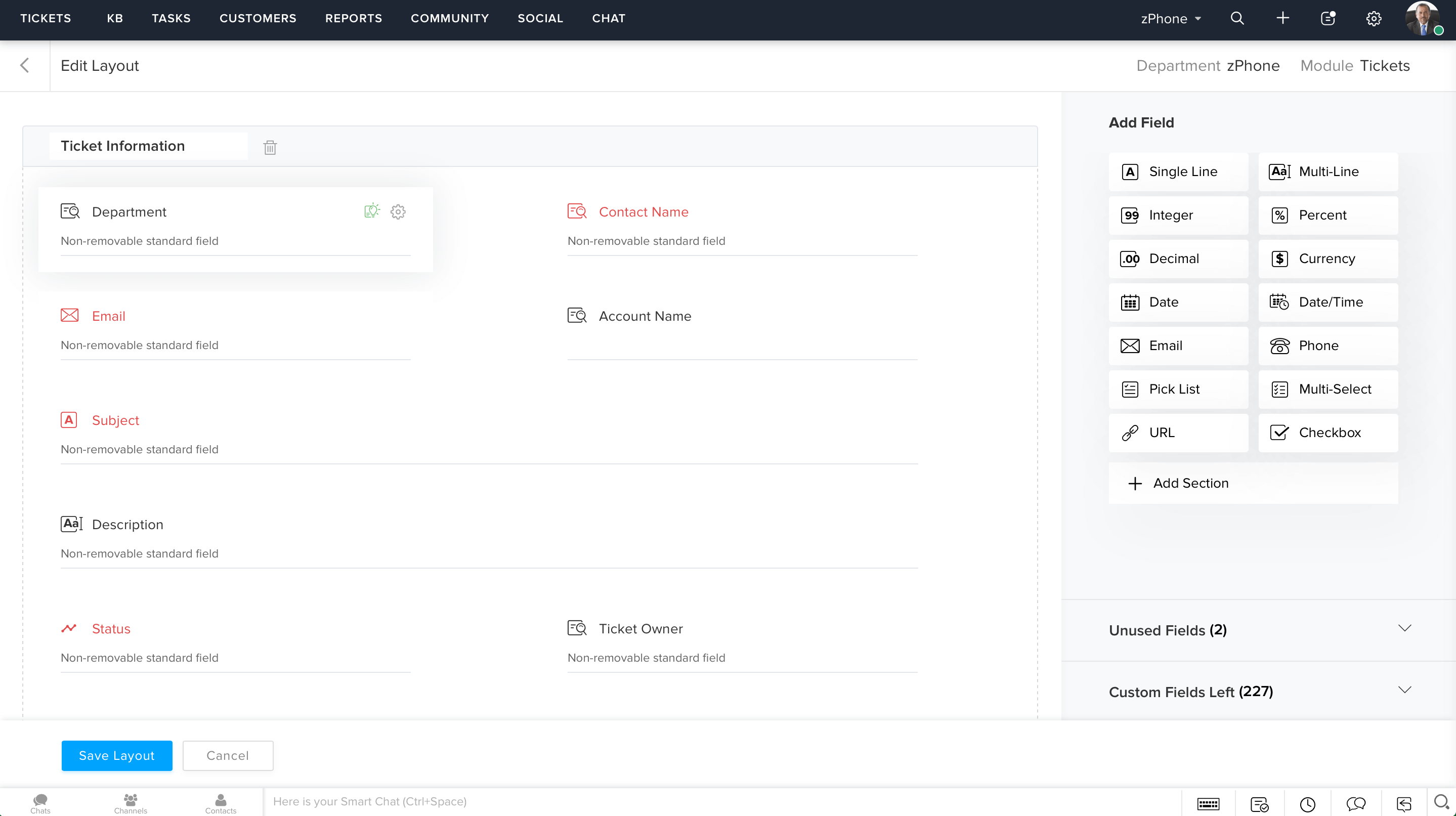 When customers fill out a web form to raise a ticket, it's important that you ask them only the information you absolutely need. Layouts make it possible for each department to have its own set of custom fields, and even a different set of values for the same field. For instance, a field called "Type" could have the values "Hardcover" and "Paperback" in the books department and have the values "Formal", "Sport", and "Sandal" in the shoes department.