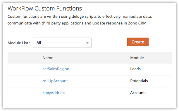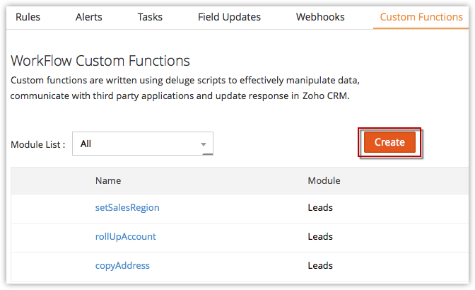 When a record matches the workflow criteria, your CRM automatically triggers the custom function and updates the CRM records. With custom functions, you can program scripts using Deluge Scripting Language, associate them to workflow rules, and automate the business process. See Also Deluge Script - Reference Guide