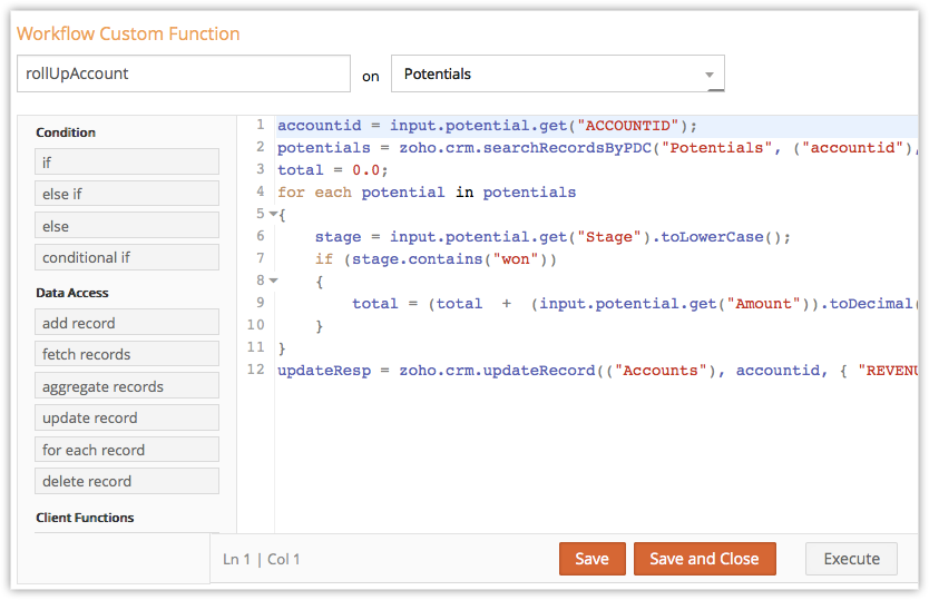 Custom functions help in automation where procedural logic is required, which cannot be implemented with the default actions such as, Alerts/Tasks/WebHooks, etc. With custom functions you can automatically update the data in the related CRM modules or third-party applications by executing simple program scripts.