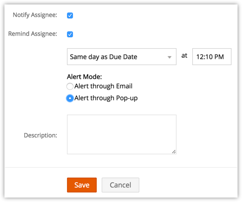 - Alert through Email - A reminder email will be sent to the task owner at the specified time.