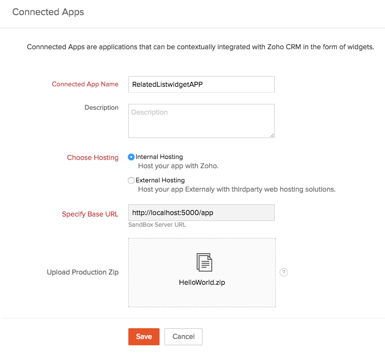 - In the Connected Apps page, select the option 'Internal Hosting' for Choose Hosting.
