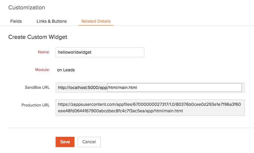 This section explains the creation of a sample "Helloworld" Related List Widget in the Lead's Module.