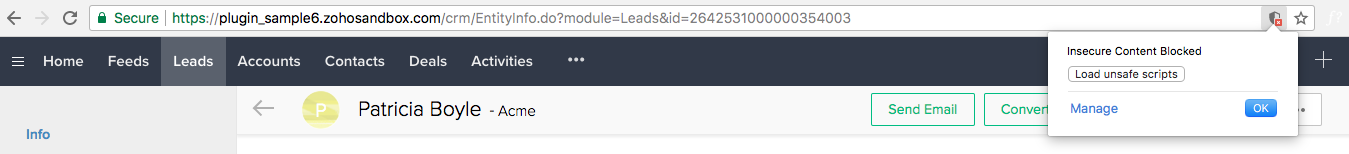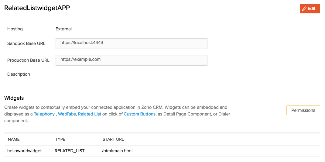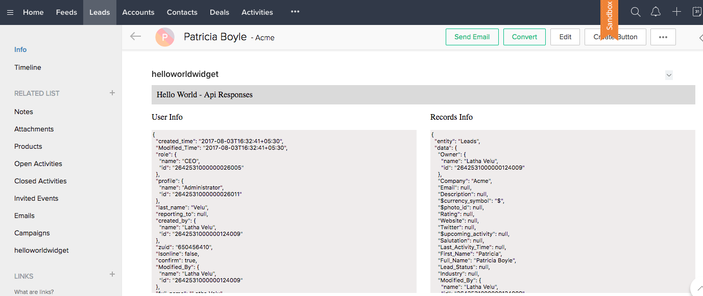 This guide will furnish you with details that will help you in building a client-side application. For ease of understanding, we have chosen a simple "Helloworld" widget to explain the steps involved. Embed this widget in a related list that will display the API response for user and record information of a particular record in your CRM's Leads module.