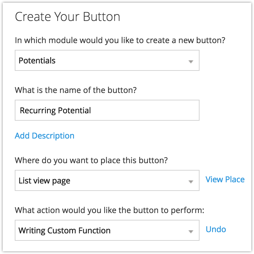 Zoho CRM offers standard buttons that execute predefined actions. For example, Convert is a standard button used to convert a Lead to Contact, Account, or Potential. Similarly, Clone is another standard button that is used to clone any record within your CRM account. If you need to add functionality not covered by our standard interface, you can create a new button and define a set of custom actions to fit your particular workflow.