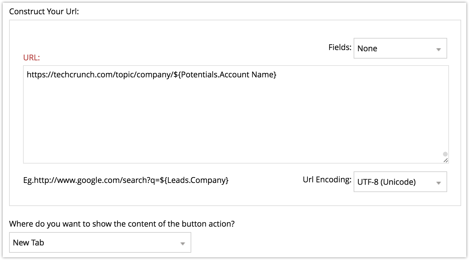 Visit Company profiles of your Leads in Zoho CRM: All the contacts in your account can have a field where you specify the Company Name. By creating a URL that is associated with a particular company, you can directly go to the account's company profile by just clicking the custom button (This custom button can be placed while creating, cloning or viewing a record based on your requirements). For example: The link can be: http://techcrunch.com/topic/company/${Accounts.Company}