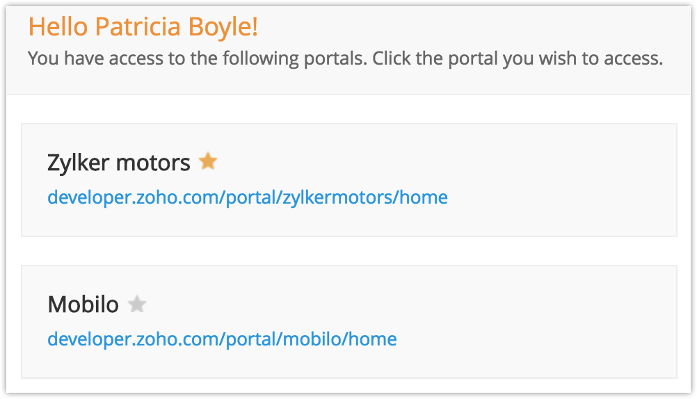 - If the user already has a Zoho Developer account, the portal corresponding to your Developer Console will be added to their list of portals.