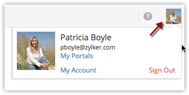 - Log into your Zoho Developer account and click on the Profile Picture that appears in the top right corner of the window.