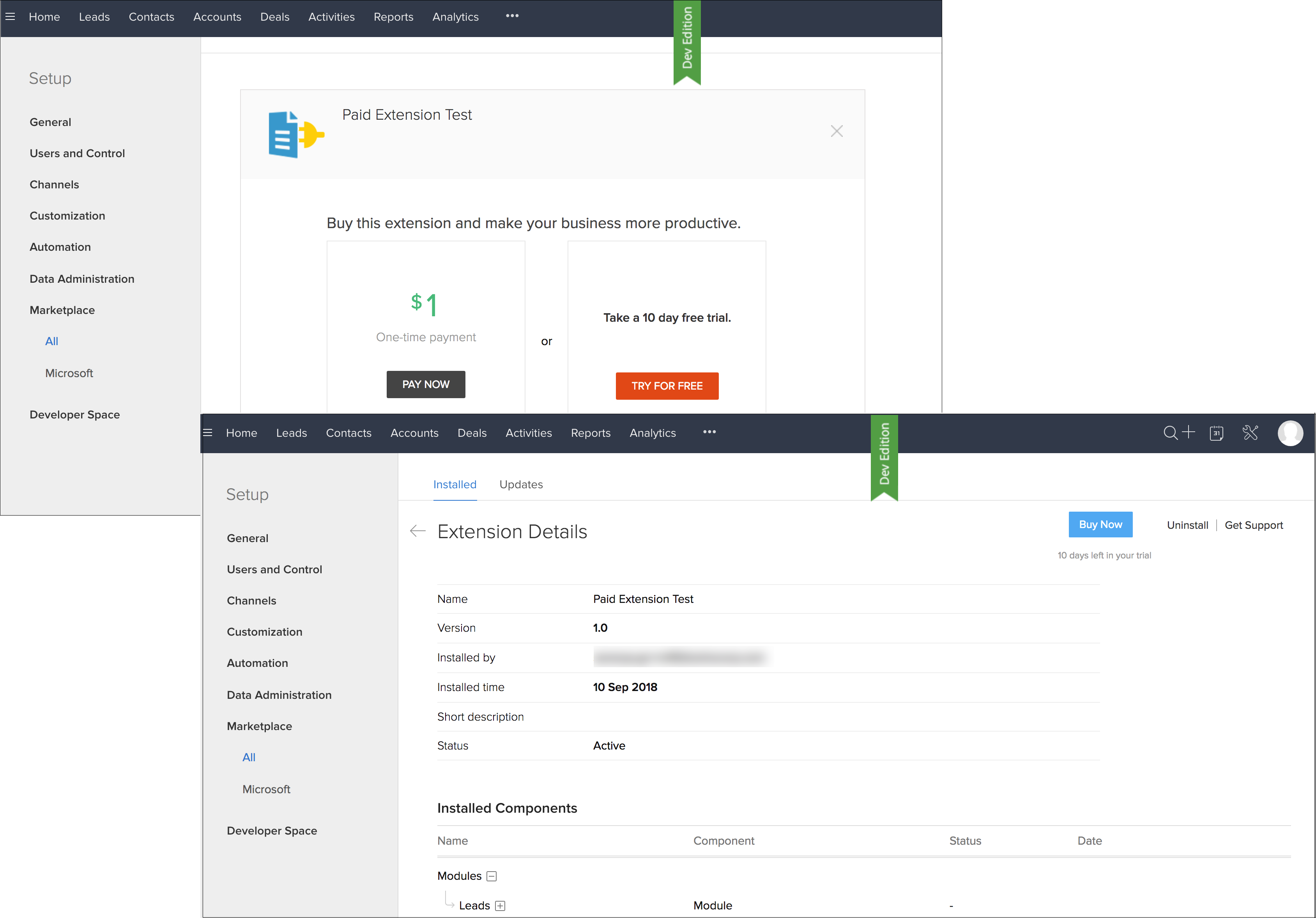 The below screenshot depicts an extension's direct purchase and a purchase after the trial period (which can be done by navigating to Setup > Marketplace > All > Installed and clicking on Buy Now).