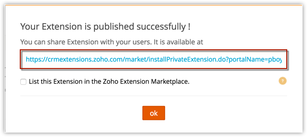 - After you've published your extension, select the checkbox labelled List this Extension in the Zoho Extension Marketplace and click OK.