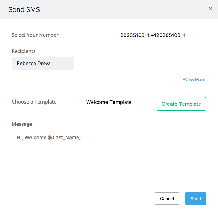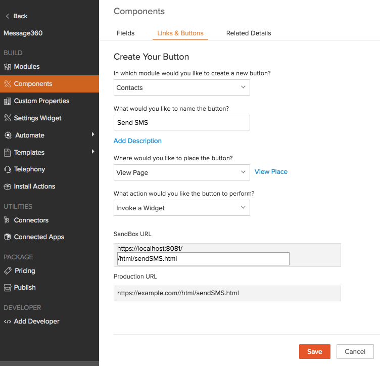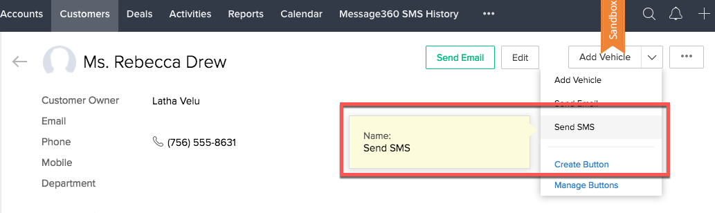 - For example, if you want to send an SMS to a Contact, then you can embed a Send SMS button to integrate with any messaging service. This button could be placed in the View, List View page or at List View - Button for each record of Contact(s).