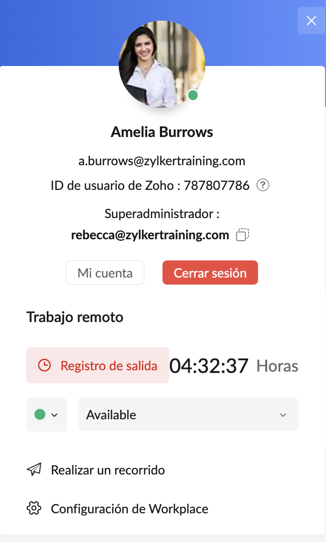 La sección Perfil de usuario de su cuenta de Zoho Mail, a la que se puede acceder haciendo clic en su imagen de perfil en la esquina superior derecha de la interfaz de correo, es una sección consolidada con todas las funciones necesarias para administrar su cuenta de Zoho Mail y el trabajo remoto.
