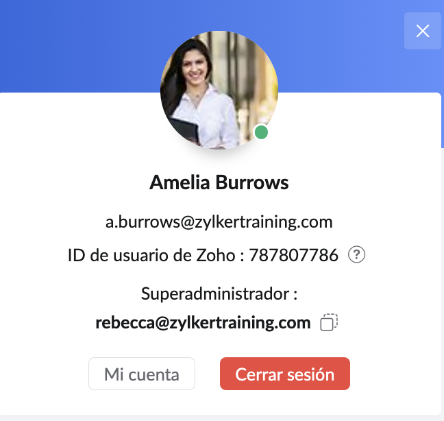 En su cuenta, puede cambiar la imagen del perfil asociada con su dirección de correo electrónico. Su foto de perfil también será visible para sus contactos de chat, los destinatarios que igualmente tienen una cuenta de Zoho y los usuarios de su organización, así como en las publicaciones en la comunidad. Esto dependerá de los permisos de foto de perfil que establezca.