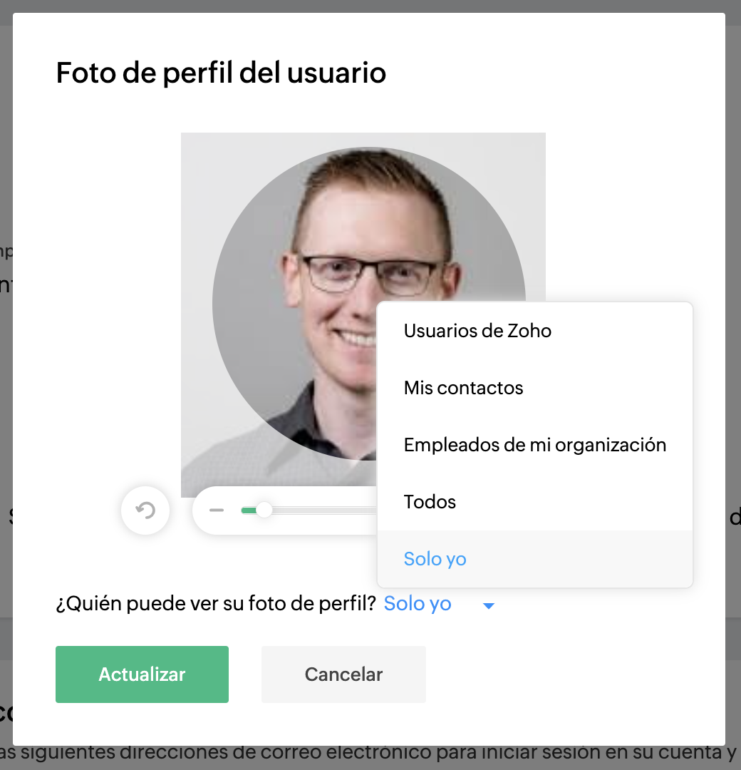 - Solo usuarios registrados de Zoho: todos los usuarios de Zoho podrán ver su foto de perfil.
