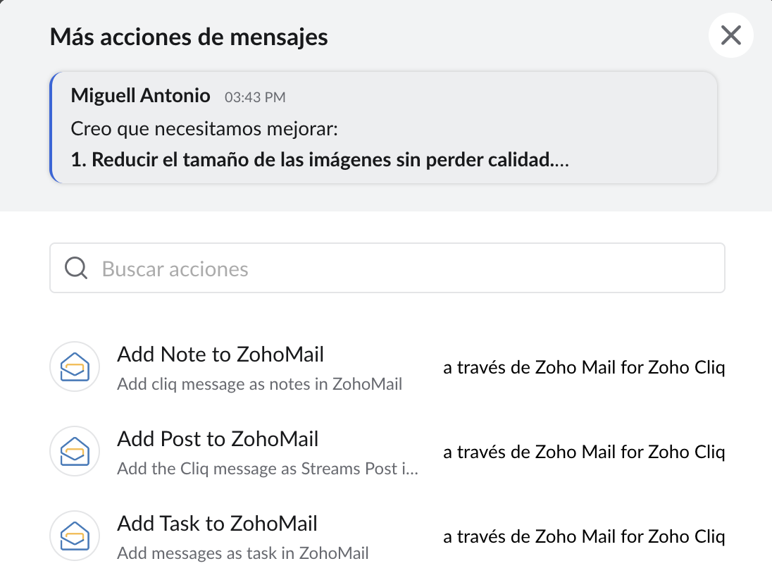 Zoho Mail para Zoho Cliq es una extensión de Cliq que le permite agregar mensajes como tareas, notas, marcadores y publicaciones de Streams a su cuenta de Zoho Mail.