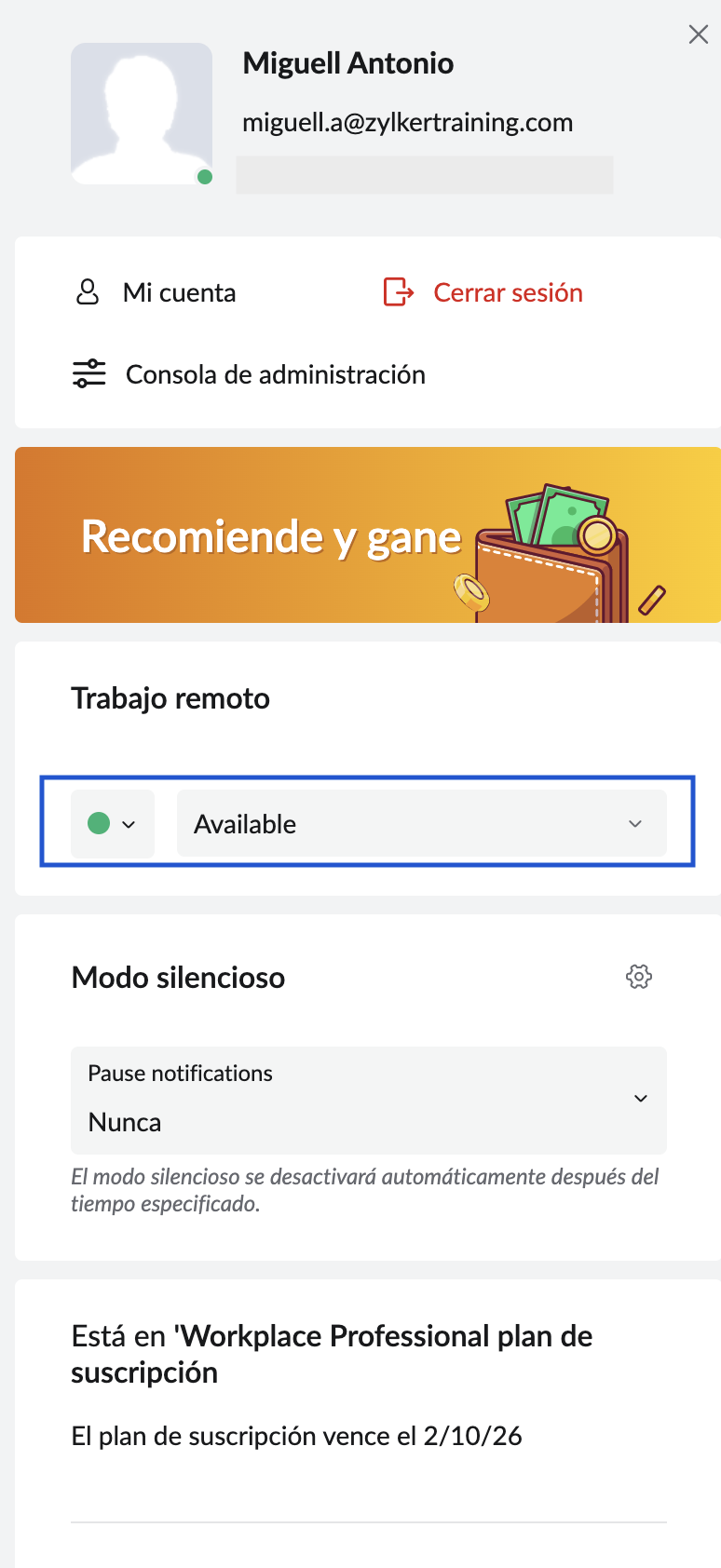 Puede agregar o cambiar su estado de disponibilidad de Cliq desde Zoho Mail. Haga clic en su Avatar (foto de perfil) y cambie su estado de Cliq desde el cuadro de selección.