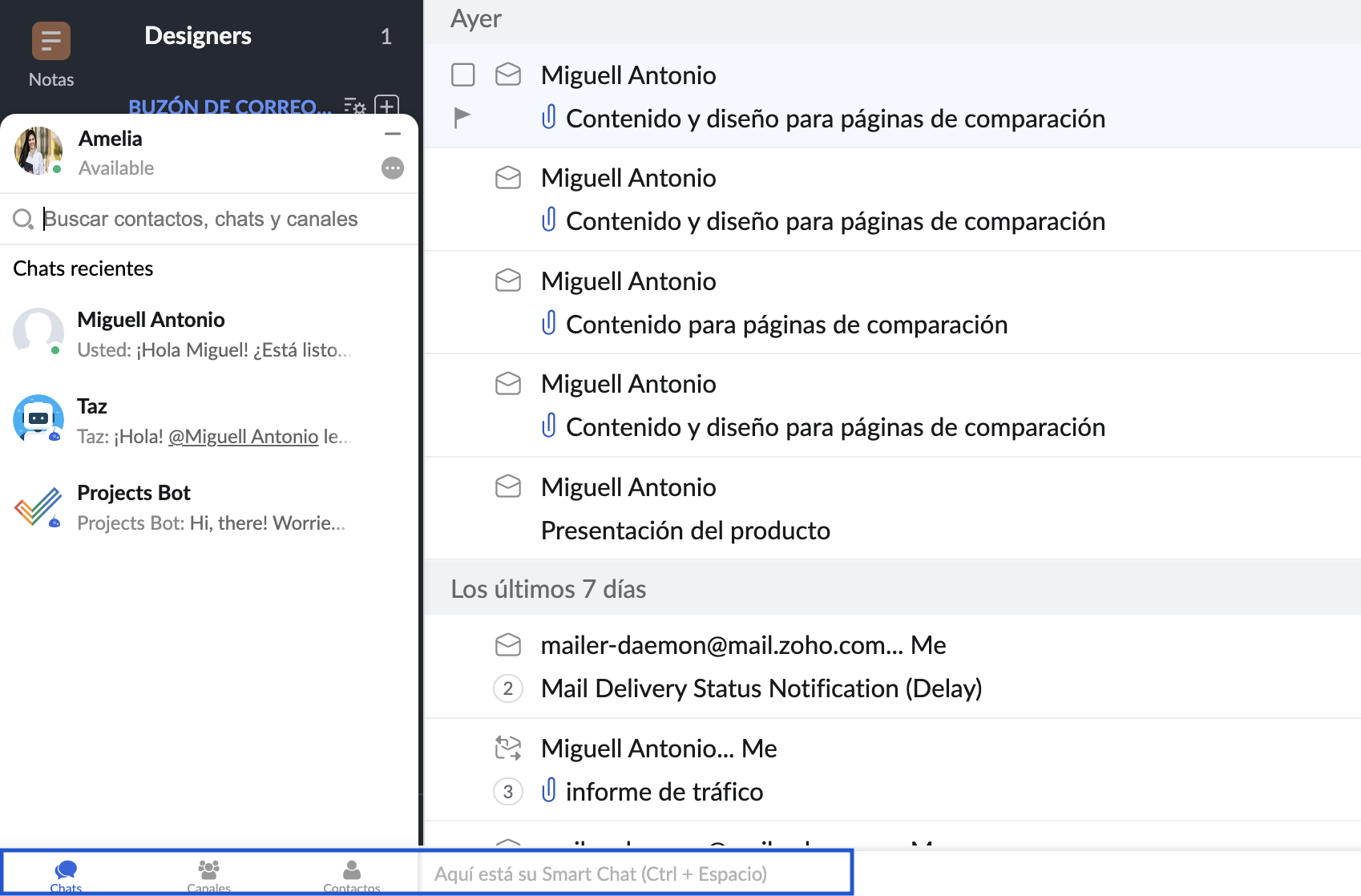 Puede acceder a los contactos, chats y canales de Zoho Cliq desde la barra de chat inteligente en la parte inferior de su buzón. Haga clic en el ícono de chats, contactos o canales en la parte inferior para buscar rápidamente en las pestañas correspondientes.